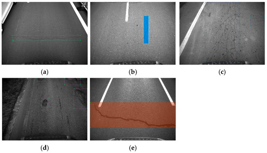 Legend of the road disease dataset: (a) Transverse crack disease (b) Longitudinal crack disease (c) Two reticular fissure diseases. (d) Four pit diseases (e) Repair disease.