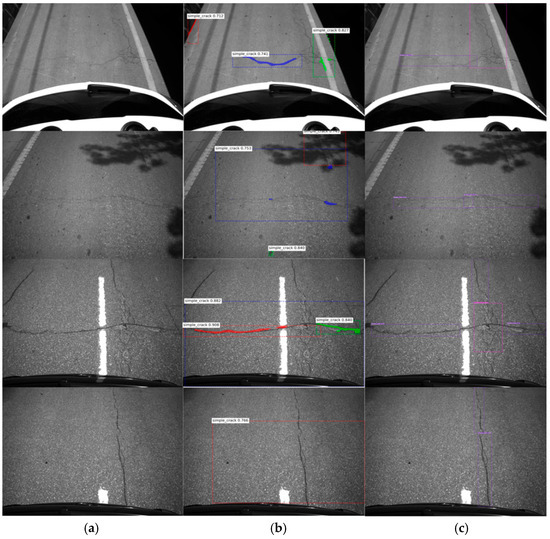 The initial validation experiment in this study aimed to assess the feasibility of the algorithm. This experiment compared the detection performance of the instance segmentation algorithm Mask R-CNN and the object detection algorithm YOLOv5 using the same set of pavement images. Mask R-CNN performs instance segmentation by first locating objects with bounding boxes and then conducting pixel-wise classification within each bounding box to segment the target objects. In contrast, YOLOv5, as an object detection algorithm, only locates objects using bounding boxes without performing pixel-level segmentation.