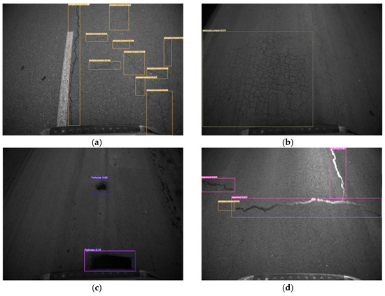 As shown in Figure 14, the results from the four validation experiments demonstrate clear and accurate distress localization and classification. These findings confirm that the YOLOv5 algorithm achieves a high level of model fitting and generalization when applied to a comprehensive pavement distress dataset. Statistical analysis reveals an overall false-negative rate of 1.13%, a recall rate of 97.35%, and a precision rate of 98.30%.
