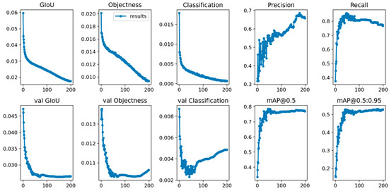 The training results of the YOLOv5 object detection model developed in this study are shown in Figure 15. It can be observed that, during the 200-step iterative process, the GIOU loss and other loss functions exhibit a gradual decrease, while accuracy and recall steadily increase, eventually converging to stable values.