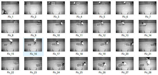 The calibration images captured for the experiment are shown in Figure 16. Among the 28 images used in this study, the position and angle of the calibration board vary across images, effectively covering the entire field of view of the camera. This diverse positioning strategy significantly reduces calibration errors.