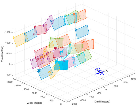 First, a corner detection algorithm was applied to identify the subpixel locations of all corner points in each image. The yellow rectangular box represents the origin corner point, while the green markers indicate the subpixel coordinates of each detected corner. Using the complete set of corner point data from all images, the camera’s intrinsic and extrinsic parameters, as well as distortion coefficients, were optimized using Zhang’s calibration method, the least squares method, and the Levenberg–Marquardt (LM) algorithm. The 3D spatial positions of the monocular camera and all calibration boards are illustrated in Figure 17.