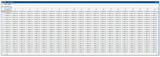 Given that the camera has a 4K resolution with 3000 × 4096 pixels, the index table contains data for approximately 12 million points, fully representing the physical spatial information of the captured image, as illustrated in Figure 18. Each entry in the index table stores four key pieces of information for each pixel: its corresponding physical length, width, diagonal length, and area, as shown in Figure 19. Ultimately, the index table comprises 48 million precise parameters, which serve as a reference for subsequent pavement distress geometric measurement algorithms.