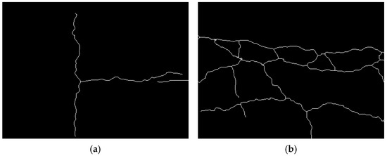 Due to the irregular geometric shape of pavement distresses, this study first calculates the length and then derives the average width. However, the accuracy of the distress skeletonization algorithm directly affects the width measurement error. To obtain the actual physical length of the distress, the binarized mask image must be processed into a skeletonized image, which consists of a single-pixel-wide representation of the distress region. The skeletonized image must be continuous and free of discontinuities or noise artifacts to ensure the most accurate length estimation.
