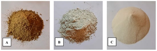 Primary materials of HSGM: (A) fly ash, (B) slag, (C), and quartz sand.