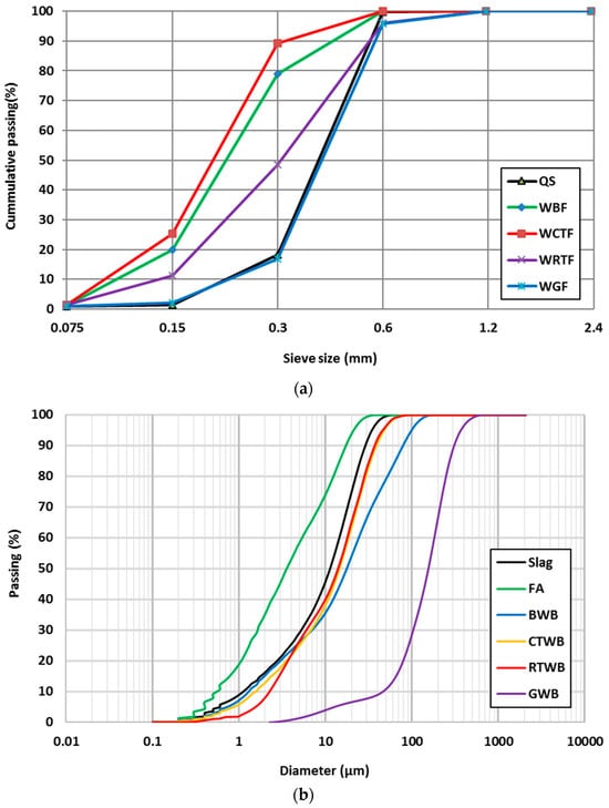 Grading curves of all materials: (a) fine aggregates and (b) binders.