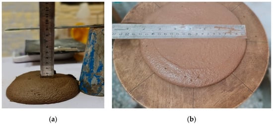 The slump test and flow table test were conducted in this study to measure the workability of the proposed HSGM mixes according to AS 1012.3.5 [33]. The slump test was conducted using a mini slump cone measuring 76 mm at the bottom, 38 mm at the top, and 119 mm in height, as shown in Figure 4. Following the slump test, the flow table test was conducted by filling a short cone-shaped mold measuring 100 mm at the bottom, 70 mm at the top, and 50 mm in height, and then, the flow table was tamped for 25 times after the mold was lifted up. The mortar flow diameter was then measured as the average of two perpendicular diameters of the final spread mortar. Compressive strength test was conducted at 7, 28, 56, and 90 days for all mixes using three 50 × 50 × 50 mm cubes per day according to ASTM C109 [34]. The test was carried out with a constant loading rate of 20 ± 2 MPa/min. The HSGMs unit weight was measured using the same cubes prepared for testing compressive strength.