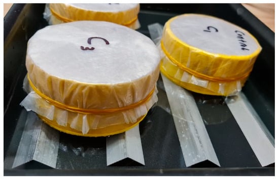The sorptivity test was conducted according to ASTM C1585 [36] by using three discs measuring 100 mm diameter and 50 mm thickness that were cut from a 200 × 100 mm cylinder per mix at 28 days. The discs were then placed in an oven at 100 °C for 24 h to stabilize their weights. Waterproof and insulating tape was used to wrap around the circumference of the circular discs. The top side of the discs was covered with several layers of loosely held plastic wrap, and the bottom side was left uncovered. The test was conducted by preparing a container with aluminum strips arranged in L-shape to form supports for the discs when placed in the container. Water was then poured into the container to a level higher than the bottom side of the discs by 1–3 mm, and the water level was maintained constant throughout the test period, as shown in Figure 5.