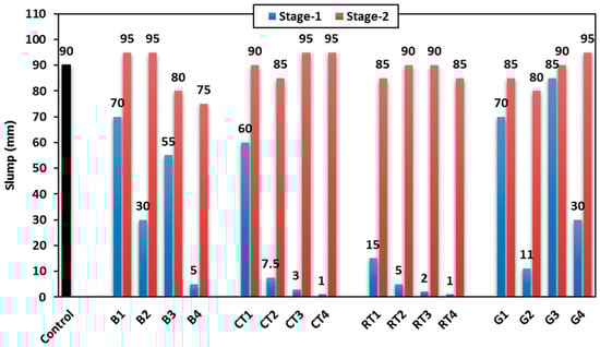 Figure 6 shows the slump values of the HSGM mixes. The control mix showed a 90 mm slump value, and it was used as the control for both stages. In Stage-1 (no extra water used), by increasing the content of CDW materials, the slump significantly decreased, regardless of the material size (binder or fine). This is attributed to the high water absorption of the CDW materials compared to the replaced traditional geopolymer materials. Among mixes incorporating CDW materials, those made with BW and GW (mixes B1, G1, and G3) could show a 70–85 mm slump with only a 5–22% decrease compared to the control mix. This is attributed to the relatively low water absorption of BW and GW compared to other utilized CDW materials. The GW also has a smooth surface, which helps to minimize friction and preserves the mortar mix’s moisture content. The lowest slump was observed when using RTW, as it could not show slump more than 15 mm with an 83% decrease, compared to the control mix. This is attributed to the relatively high water absorption of RTW, in addition to its rough surface, which increases the friction within the mortar matrix, and hence, workability decreases. When using 25% of CTWB, the slump decreased by 33.3% (60 mm); however, when the CTWB increased to 50%, the slump significantly decreased by 91.7%, as shown in Figure 6.