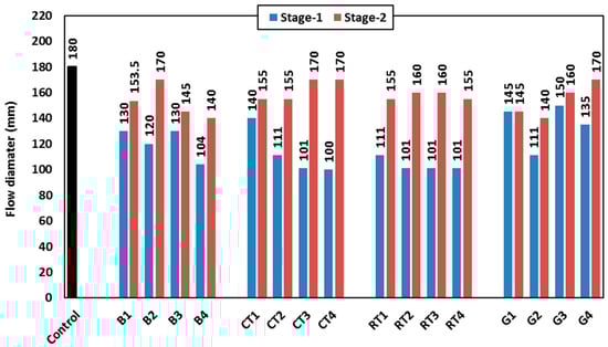 In Stage-2, the flow diameter increased compared to Stage-1 and ranged from 140 to 170 mm. It was not observed that the flow diameter significantly changed with the change in CDW material or content. Mixes B2, CT3, CT4, and G4 exhibited the highest flowability among all CDW mixes.