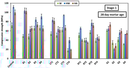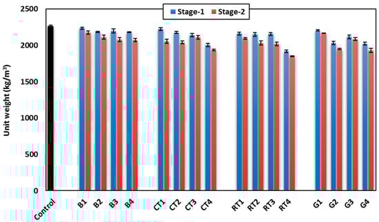 The measured average unit weight for each HSGM mix is shown in Figure 8 for both stages in this study. The results showed that, when the substitution rate increased from 25% to 50%, the unit weight decreased in all CDW mixes. This indicates that the CDW are lighter than the traditional precursor (slag, FA, and quartz sand) used in the control mix, especially the fine aggregate waste in Stage-1. The unit weight of the control mix was 2258 kg/m3. This value decreased to 1920 kg/m3 when 50% of quartz sand was replaced by RTW (15% decrease). The unit weight of mixes made in Stage-2 showed a similar trend to that shown in Stage-1, as can be observed in Figure 8.