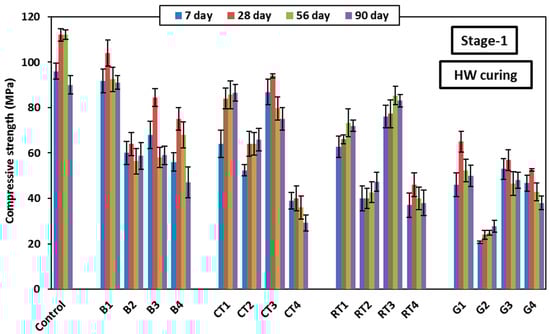 Figure 9 shows the 28-day compressive strength varation of the HSGM mixes at different curing conditions applied in Stage-1. As shown in the figure, the HW curing condition showed the highest 28-day compressive strength in the control mix (112 MPa), as well as the CDW mixes (up to 104 MPa), except the GW mixes that showed higher compressive strength when cured in HA. The advantage observed in compressive strength when using heat curing may be due to the slag containing calcium oxide (CaO), which reacts more quickly to produce calcium silicate hydrate (C-S-H) and calcium aluminosilicate hydrate (C-A-S-H). These are the main compounds that enhance compressive strength in mortar. These compounds create very solid gels that reinforce the structure and increase the material’s density. These gels form a matrix of strong chemical bonds that contribute to material strengthening, making it more capable of withstanding pressure. Consequently, the increase in mortar strength primarily arises from the formation of these gels during the early days after curing, improving the material’s compressive resistance. In addition, the high temperature also speeds up the chemical reactions in geopolymers, which promotes the material’s ability to create internal interactions. This makes the geopolymer’s structure stronger and denser by hastening the solidification process.