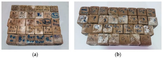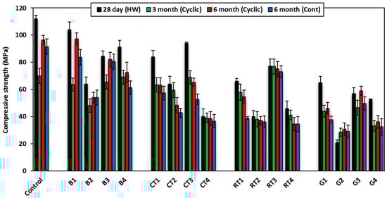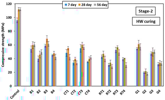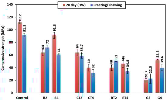 Freezing/thawing and sulfate attack effects were measured on the compressive strength and weight difference of the HSGMs at 28 days. The tests were performed on cubes measuring 50 × 50 × 50 mm after HW curing. The cubes were placed in an oven at 100 °C for 24 h to stabilize their weight as the dry weight. The freezing/thawing test was carried out on selected mixes, namely, control, B2, B4, CT2, CT4, RT2, RT4, G2, and G4. The sulfate attack effect was carried out on all HSGM mixes.