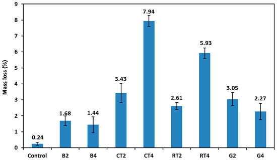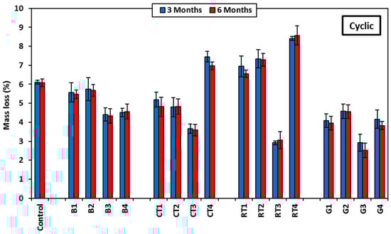 Figure 13 shows the mass loss results of the selected HSGMs after 100 cycles of freezing/thawing. The tested specimens showed no visible flaking or cracks on the surface of the specimens; only slight spalling was noted. When using CDW in mortar, the mass loss after freezing/thawing cycles significantly increased. The control mix showed a mass loss of 0.24%, while the mass loss for the rest of the mixes ranged from 1.44% to 7.94%. The CT4 mix (contained 50% CTWF) exhibited the highest mass loss and was followed by the RT4 mix (contained 50% RTWF). This is attributed to the materials’ increased vulnerability to mechanical degradation as a result of frequent expansion and contraction.