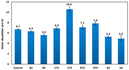 The water absorption test was conducted on the mixes containing 50% of CDW after 28 days of HW curing, as shown in Figure 17. As expected, the results showed that the highest water absorption percentage occurred when using CTW and RTW, especially when used as a fine aggregate. This is because of their very high porosity, leading to significant water absorption. Compared to the control mix, the water absorption of RT4 and CT4 mixes increased by 17.3% and 57.8%, respectively. This could be attributed to the CTW that is a mix of floor and wall tile wastes, which may not be homogeneous in particle distribution, resulting in poor adhesion and high voids, leading to higher water absorption. Also, it can be due to the possibility that a higher SH concentration would dissolve more alumino-silica, creating an excess of space that would ultimately create pores leading to an increase in the absorption rate [49]. The absorption rate increased in mixes CT2 and RT2 by 3% and 5.8%, respectively, when utilizing CTW and RTW with 50% as a binder. This is due to the presence of fine capillary pores as the internal pores in the matrix have a significant impact on water absorption, which is consistent with what was reported by Cai et al. [50]. The results also showed that the BW and GW mixes gave a lower water absorption percentage than the control mix, whether they were used as a binder or fine aggregate. This is due to the reduced porosity and, consequently, the lower water absorption, especially mixes G2 and G4, which gave the lowest percentages of 21.5% and 26.5%, respectively. This could be due to the lower porosity of glass than slag/fly ash and quartz sand and the smooth surface of the particles.