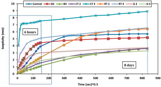 The test was separated into two phases: initial sorptivity (took place within 0–6 h) and secondary sorptivity (took place over 8 days). The initial and secondary sorptivity coefficients in this study were calculated using data from both phases.