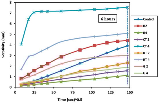 Figure 18 shows the water sorptivity index values for all HSGM mixes in this study throughout 8 days. Figure 19 examines the initial sorptivity from 1 min to 6 h to assess the rise in the sorptivity coefficient during both early and late phases. The intial sorptivity rates are high but eventually decline, as seen in Figure 18. Numerous capillary pores close to the submerged sample’s surface quickly become saturated, which is followed by the filling of finer pores further away from the surface. According to the results, the CT4 and RT4 mixes showed the highest sorptivity rates over the first six hours compared to the control mix (sorptivity increased by 92% and 30%, respectively). This resulted from the increased porosity and lower density of these mixes, which was consistent with a prior study [51], which found that the main factors influencing concrete’s sorptivity are its density and microstructure. As density decreases, sorptivity rises due to an increase in pore volume. Furthermore, RTW and CTW particles’ porous surfaces help to create sizable air holes at their interfaces, which increases their capacity to absorb water.