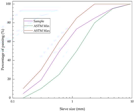 In this study, the natural sand used for the cement mortar was sourced from Lalibela. The gradation curve for fine aggregates, determined through sieve analysis in accordance with ASTM C33 [25], is shown in Figure 1. This curve indicates that the sand complies with the upper and lower limits set by ASTM standards. Several key physical properties, including water absorption, bulk density, specific gravity, silt content, moisture content, and fineness modulus, were conducted in accordance with ASTM standards to check the suitability of fine aggregate for mortar production. The test results and the corresponding standards are summarized in Table 3.
