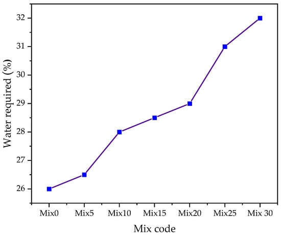 The normal consistency method was employed to determine the water content required for cement pastes, which would be used in subsequent tests. The results revealed that the consistency of the blended cement increased as the percentage replacement of PC with RHA and WMP increased. This phenomenon can be attributed to the higher fineness of WMP compared to PC [11] and the porous structure of RHA significantly reduced workability due to its direct water absorption [38]. As shown in Figure 2, all replacement mixtures require more water than the control mix. However, the water demand remained within the acceptable range of 26–33%, as specified by ASTM C187 [31]. The increase in water requirement can be further explained by the high specific surface area of RHA and WMP, which are significantly finer than PC. The finer particles absorb more water to form a cohesive paste, thereby increasing the consistency of the blended cement. Additionally, the increase in cement replacement levels with RHA and WMP corresponded to a proportional increase in consistency due to the finer particle size and higher specific surface area of the replacement materials compared to PC [35].