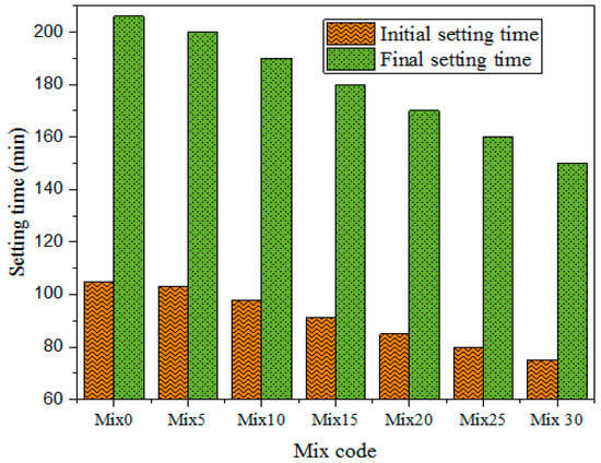 To assess the consistency of the paste, samples were prepared and mixed until they achieved normal consistency, defined by a Vicat plunger penetration of 10 ± 1 mm, in accordance with ASTM C187 [31]. The setting time was then measured using the Vicat apparatus, which determines both the initial setting time—the duration from water addition until the paste ceases to be fluid and plastic—and the final setting time, when the paste attains a specified level of hardness, following ASTM C191 [32].