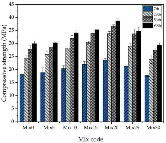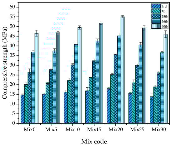 The compressive strength of cement mortar containing RHA and WMP as partial replacements for cement was evaluated using a standard compressive strength testing machine, following ASTMC 109 [30]. Mortar cube samples were prepared for the 3rd, 7th, 28th, 56th, and 91th days. Three samples were prepared and tested for each mix at specified dates. Figure 5 illustrates the compressive strength results across various replacement levels of cement with RHA and WMP. The results reveal a significant influence of these materials on the mechanical properties of the mortar.