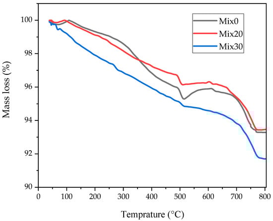 The decomposition of cement hydrates during TGA is generally observed in three distinct stages. The first stage, occurring between 25 °C and 105 °C, is characterized by the loss of free water. Following this, between 105 °C and 400 °C, the hydration products undergo dehydration. In the second stage, from 400 °C to 600 °C, Mix0 and Mix20 experience significant mass loss in this range. This mass loss corresponds to the thermal decomposition of calcium hydroxide (Ca(OH)2) into calcium oxide (CaO) and water vapor. The third and the final stage corresponds to decarbonation of CaCO3 from 600 °C to 800 °C, where the material releases carbon dioxide (CO2) upon heating. These stages provide a clear indication of the thermal behavior of cement-based materials under varying temperature conditions [48].