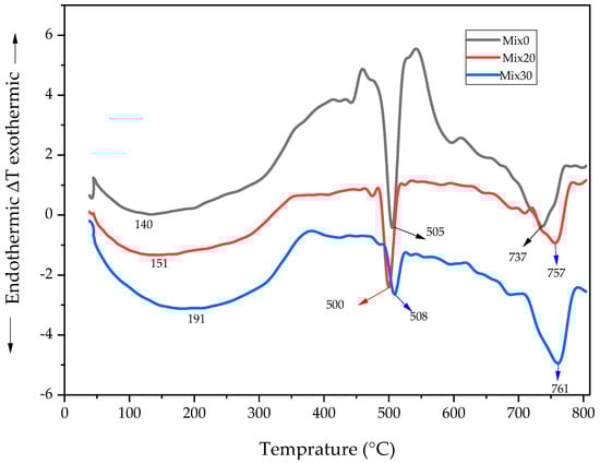 As shown in the DTA curves, the endothermic peaks associated with the decomposition of calcium hydroxide appear at 505 °C, 500 °C, and 508 °C for 0%, 20%, and 30% replacement, respectively. In contrast, the exothermic peaks corresponding to the breakdown of C-S-H gel occur at 414 °C, 357 °C, and 378 °C for 0%, 20%, and 30% replacement, respectively. These shifts in thermal behavior demonstrate the influence of the RHA and WMP additives on the thermal properties of the cement mortar, highlighting differences in hydration and decomposition patterns.