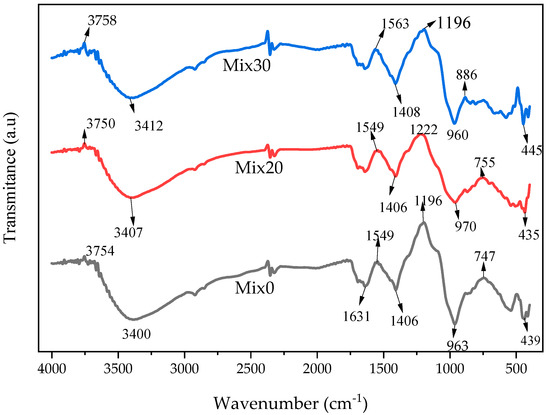 Fourier transform infrared spectroscopy (FTIR) analysis of hardened mortar was conducted to examine the potential of chemical changes resulting from the addition of admixtures. This analysis identified the presence of organics, such as OH hydroxyl groups, C-O-C stretching vibrations [52]. In FTIR analysis, infrared radiation is passed through the sample, with some radiation being absorbed and some transmitted. The resulting spectrum represents the molecular absorption and transmission, creating a molecular fingerprint of the sample. This fingerprint can be used to identify unknown materials, assess the quality or consistency of the sample, and determine the composition of mixture [41]. According to [47], FTIR is a method for identifying chemical functional groups in a product, where the specific wavelengths absorbed are characteristic of the chemical groups present in the analyzed material. The measurements were carried out using an IRAFFINITY-1 apparatus, with a scanning range between 400 and 4000 cm−1, 40 scans, and a resolution of 4 cm−1. The main characteristic peaks of C-S-H are located in the range of 1100–900 cm−1 [53].