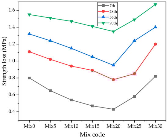 As shown in Figure 11, the compressive strength reduction caused by sulfate attack decreased with up to 20% cement replacement. This is due to adding RHA to the mortar making it better at resisting damage from sodium sulfate because of RHA has much less aluminum, which helps prevent the harmful reactions that cause expansion and cracking in concrete [57]. Beyond its influence on aluminum oxide (Al2O3) content, the physical characteristics and pozzolanic properties of RHA are critical for enhancing sulfate resistance. The pozzolanic reaction occurs when RHA interacts with the calcium hydroxide generated during cement hydration, leading to the formation of additional calcium silicate hydrates (C-S-H). This process results in a denser and more resilient cementitious matrix that is better equipped to withstand sulfate attacks [45]. For instance, at 28 days of curing, the strength reduction was 1.11 MPa for 0% replacement and 0.78 MPa for 20% replacement. However, beyond the 20% replacement level, sulfate resistance began to decline, with the lowest resistance observed at 30% replacement. This decrease may be due to excessive replacement altering the mortar’s composition and pore structure, thereby reducing its resistance to sulfate attack.