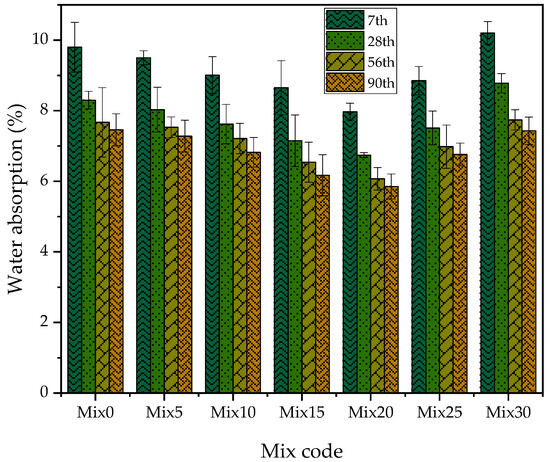 As illustrated in Figure 12, the optimal replacement level to minimized water absorption was found to be 20%. At this replacement level, the water absorption at 28 days of curing was reduced to 6.34%, compared to 8.3 in the control mix sample. Similarly, at 91 days, water absorption decreased to 5.85% at 20% replacement, compared to 7.46% in the control sample. This finding aligns with the results of [58] which reported a 16.3% reduction in water absorption when 20% RHA replaced cement and 30% MWP substituted fine aggregate. The significant reduction is attributed to the synergistic effects of the pozzolanic reaction, additional C-S-H gel formation, and pore refinement. However, beyond the 20% replacement threshold, water absorption begins to increase, with the maximum water absorption at 30% replacement level, surpassing that of the control sample.