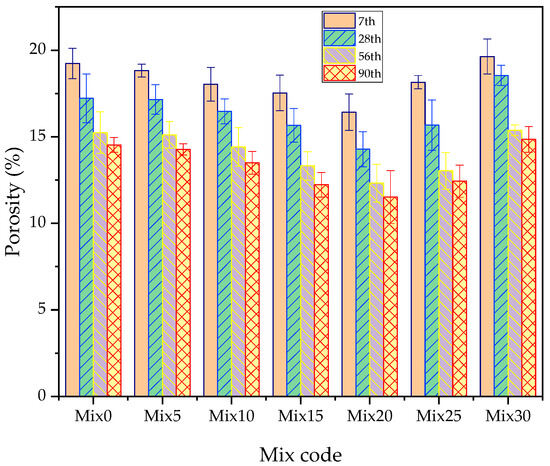The experimental results reveal that the porosity of cement mortar cubes containing RHA and WMP decreases with increasing replacement percentages up to 20%, as shown in Figure 13. This result is also supported by researchers that state that the porosity and sorptivity of the concrete material were reduced when cement is replaced by up to 15–30% RHA and WMP [37,60]. Specifically, the porosity is reduced from 16.22% to 13.28% at 28 days of curing and from 15.53% to 12.52% at 91 days of curing as the replacement level increased from 0% to 20%. This reduction is attributed to the pozzolanic activity of RHA, which reacts with calcium hydroxide to generate additional hydration products, and the filler effect of RHA and WMP, whose fineness surpasses that of cement. These factors enhance pore refinement and reduce overall porosity.