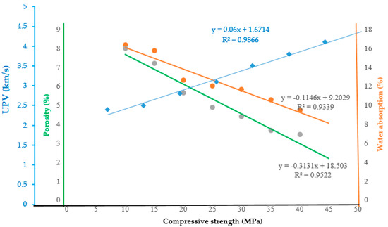 The relationships among compressive strength, water absorption, ultrasonic pulse velocity, and porosity were analyzed using the experimental data, as illustrated in Figure 14. A strong correlation was observed between compressive strength and UPV, with a coefficient of determination (R2) of 0.9866, indicating a direct and significant relationship. This strong correlation reflects the homogeneity of the mortars and confirms that as compressive strength increases, UPV values also increase, demonstrating the densification and integrity of the cementitious matrix.