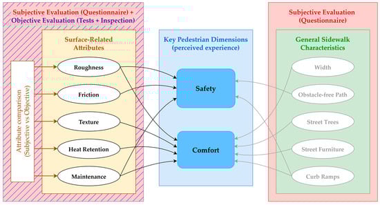 Despite the significant impact of sidewalk paving materials on pedestrian safety and comfort, this topic remains underexplored, and these attributes have rarely been included in walkability evaluations [,] for various reasons. First, research on sidewalk infrastructure is limited due to a generalized lack of publicly available data on sidewalk conditions [,,,]. Most cities do not systematically collect data on sidewalk material types, conditions, and maintenance [,]. Although recent advancements in data collection, such as machine learning [,] and mobile-based assessments [,], have improved evaluation methods, sidewalk data remain incomplete, inconsistent, or unavailable on the city scale, limiting its integration into comprehensive walkability assessments. Second, most paving studies focus on roadways rather than sidewalks, and cities lack technical guidance for sidewalk policy and management []. As a result, the influence of specific sidewalk paving attributes, such as surface irregularity and friction, on pedestrian safety and comfort remains underexplored. The lack of adequate items for assessing the sidewalk condition and maintenance and insufficient factors for evaluating fall-related safety is further supported by Aghaabbasi et al. []. Third, limited research combines technical evaluations with qualitative assessments of pedestrian perceptions []. Since user perceptions can complement objective measures, surveys offer valuable insights into walking experiences [] and attitudes toward sidewalk pavement quality []. Incorporating this feedback into walkability frameworks can improve infrastructure prioritization and support the design of more inclusive public spaces.