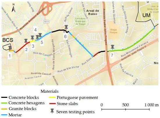 Sidewalk materials along the studied pedestrian route in Braga (numbers 1–7 correspond to the specific locations of the seven surface testing points).