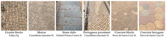 Second, the route includes various paving materials representing the city’s sidewalks, reflecting common design choices and construction practices. The selected route is paved with different materials, including granite blocks (cobblestones), mortar, granite stone slabs, Portuguese pavement, concrete blocks, and concrete hexagons (Figure 3). Specific streets, such as Conselheiro Januário Street, have a mix of paving materials, including stone slabs, Portuguese pavement, concrete blocks, and mortar. Concrete is the most prevalent paving material along the route, covering substantial portions of the pathway. Specifically, concrete hexagons account for 32%, while concrete blocks comprise 17% of the total route length. The other sidewalk materials used in the route include mortar (29%), granite stone slabs (14%), granite blocks (6%), and Portuguese pavement (2%). Ferreira [] also noted that these sidewalk paving materials are the most frequent in Portugal. Pedestrian crossings and overpasses were excluded from the analysis, as this study focuses specifically on sidewalk pavements.