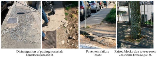 Third, it features a range of sidewalk characteristics that reflect different phases of urban development and evolving paving techniques. This range includes recently improved sidewalks and sections with noticeable distress, such as cracked, uneven, and broken surfaces (Figure 4), representing a wide range of pavement maintenance conditions relevant to assessing the pedestrian experience. For instance, while Nova de Santa Cruz Street’s sidewalks have been recently improved, some areas still exhibit pavement deterioration.
