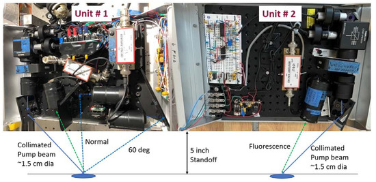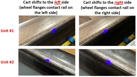 Two lubricity detection devices, referred to as “Unit 1” and “Unit 2”, were fabricated to monitor the lubrication conditions on the left and right rails, as shown in Figure 2. Both units are equipped with identical laser emitters and filters. Both devices are aligned and angled toward the rail surface using identical geometric configurations, with the sole distinction that one unit mirrors the other one in down-track beam orientation. This setup ensures that each rail is evaluated at an identical interception angle relative to the cart’s movement along the rail. The two units were initially mounted to a controlled robotic cart, shown in Figure 3, which will be detailed later.