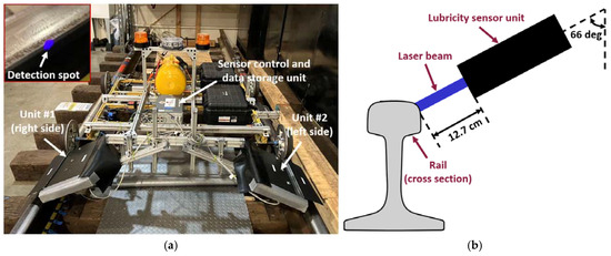 Figure 3. (a) RTL system mounted on a remote-controlled rail cart; (b) schematic diagram of sensing unit for detecting the lubrication condition.