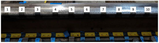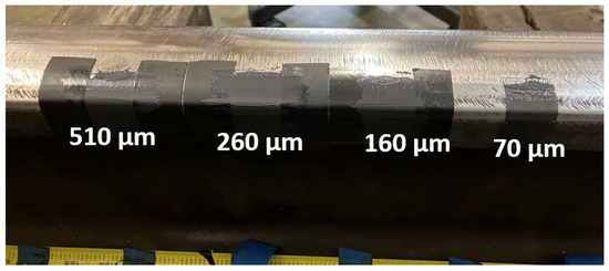 The custom dataset used to train the machine learning model was prepared by performing tests on a 40 ft track panel in the RTL laboratories. Nine grease samples with thicknesses of 50, 70, 100, 160, 260, 510, 760, 1260, and 1770 µm were applied to the flange face of the rail, as shown in Figure 11. To ensure consistency in grease application, we applied each grease sample between adhesive strips with calibrated thickness.