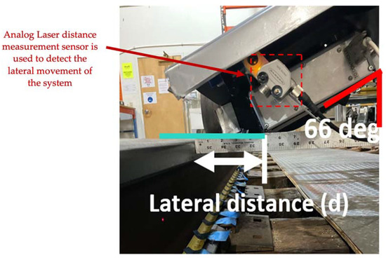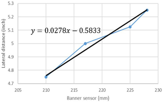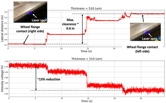 To support compensation of this effect, a Q4X300, 25–300 mm Analog Laser® distance measurement sensor manufactured by Banner Engineering Inc. in Aberdeen and Huron, South Dakota, USA, is used to detect the lateral standoff distance to the railhead as a proxy for the lateral movement of the cart, as shown in Figure 7. Calibrations were conducted in the lab to evaluate the effect of cart movement on the LiDAR measurements. Each grease sample was again applied to the rail with an identical thickness of 510 µm, and measurements were made for varying lateral displacement. The calibration results were subsequently used to adjust laboratory and field measurements appropriately from the mounted RTL sensors.