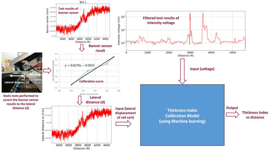Figure 10 illustrates the framework of the proposed methodology used for the thickness prediction of the grease. The distance LiDAR sensor records the lateral movement of the cart that is plotted against the distance traveled by the cart. Since the measurements do not reflect the absolute value of ’d’, a series of static tests were performed to relate the sensor’s output with actual distances. These values act as one of the two inputs to an ML calibration model. The fluorescence intensity measurements recorded by the RTL system are post-processed and filtered to remove any noise from uncorrelated disturbances. This filtered data acts as the second input to the model. The model then establishes the relationships between the two inputs and predicts the thickness index of flange grease.