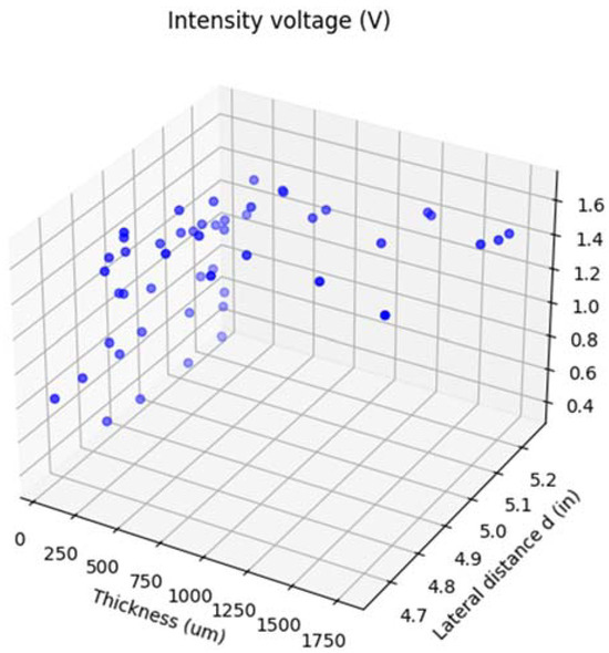 For each thickness, the intensity and displacement (‘d’) voltage measurements from the cart-mounted sensors were made at different lateral positions of the rail cart. Figure 12 shows plane-view schematics of the rail cart for four cases of the different lateral positions for which the sensor measurements were recorded. A dataset containing 50 data points was assembled from the combination of different thicknesses and values of ‘d’, as shown in Figure 13. This dataset was then preprocessed as described below before training the model.