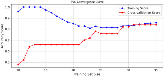 To further assess the model’s performance, we plotted the convergence curve illustrating the training scores and validation scores across different training sizes, as shown in Figure 14. The curve provides insights on how the training and cross-validation accuracy evolve as the number of training samples increases. Out of the 50 samples in the dataset, 35 samples (70%) were used for training. The curve shows respective scores for training samples between 10 and 35 because a lower number of samples did not make a significant contribution to the cross-validation scores. The training score (blue curve) starts near 100% when very few samples are available, indicating overfitting to a small dataset. However, as the dataset grows, the training score gradually decreases and stabilizes around 89%, reflecting improved generalization. The cross-validation accuracy (red curve) starts much lower (~50%) due to limited data for generalization but steadily improves as more samples are added, eventually converging near 83–84%. The gap between training and validation accuracy narrows, confirming that the model is not overfitting. This convergence suggests that the selected hyperparameters (C = 1, γ = ‘scale’) effectively balance bias and variance, ensuring stable generalization.