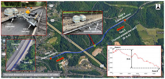 The low-speed field test was conducted on a revenue service track in Christiansburg, VA, with help from one of the Class 1 railroads. The test route, cart setup, and change in elevation are shown in Figure 18. During the test, the rail cart was initially run from Point A to Point B in Figure 18, covering a total distance of 1.07 miles and passing through a rail grease applicator, identified by the green dot. The cart was then turned around and operated from Point B to the starting point, Point A.