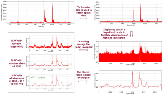 Figure 19. Methodology implemented to process the raw fluorescence data collected from the RTL sensing system. Red plots: Top left plot–Intensity voltage data as a function of Time; Top right plot–Spatial data obtained from Tachometer; Central right–Spatial data visualized in logarithmic scale; Central left plots–Plots with different window sizes for Moving Average Filter; Bottom right plot: Filtered intensity voltage data as a function of Distance travelled.