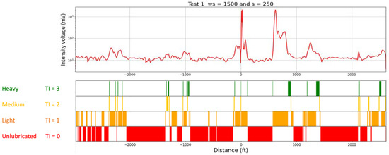 As an alternative, the Railway Technologies Laboratory (RTL) has developed an optical sensing system for detecting rail greases that can be mounted easily on Hyrail trucks or other track vehicles frequently used by track engineering personnel and maintenance crews [13]. This sensing system uses a “laser-induced fluorescence optical method (LFOM)” to detect the presence of flange-face greases and their relative thicknesses. The measurement of grease thickness gives a more detailed assessment of the lubrication condition, which is critical for maintenance operations and improving lubrication practices. Measuring the grease thickness is essential to maintaining a balance between over-lubrication and under-lubrication, both of which can significantly impact rail performance and safety. In over-lubricated conditions, excessive grease can migrate to the running surface of the rail, leading to reduced traction, increased slippage, and compromised braking efficiency, all of which pose safety hazards. Unnecessary lubrication can also contribute to increased environmental contamination. On the other hand, under-lubrication results in increased friction between the wheel flange and rail, accelerating wear on both components and generating excessive noise and energy (i.e., fuel) consumption [14].