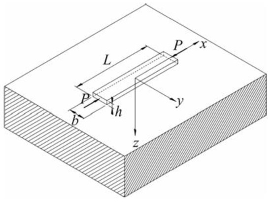 is the distance between two points x , y and ( x ^ , y ^ ) on the contact surface between the beam and half-space. In this case, half-space reactions can vary along both directions of the contact surface, whereas the beam hypothesis considers its rigidity along the y direction, hence v x , y = v ( x ) . In a recent contribution dedicated to the buckling of slender beams and coatings on the elastic half-space, buckling loads turned out to be strictly related to the length-to-width ratio ( χ = L / b ), and for decreasing such a ratio, a convergence of critical loads to those typical of plane strain conditions was found [31].