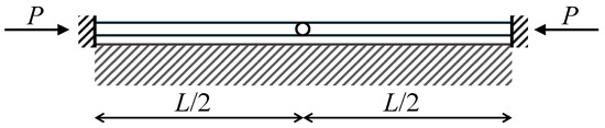 Figure 4. Compressed beam with an internal hinge at midpoint and fixed ends, on elastic support.