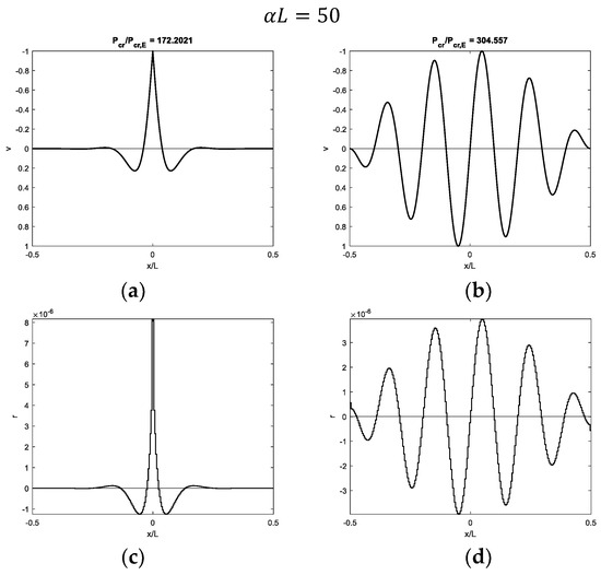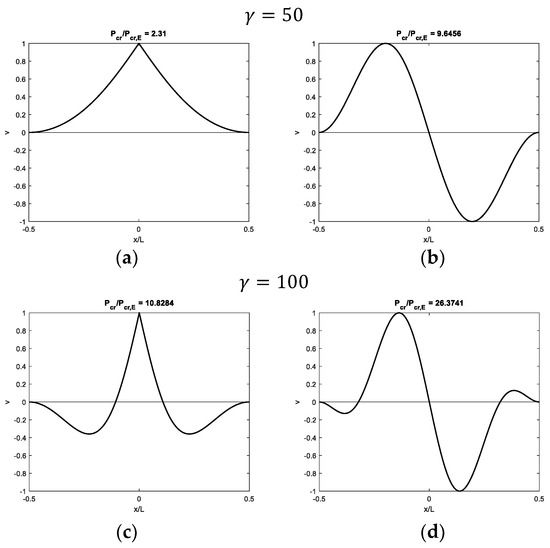 It is finally worth noting that all the modal shapes corresponding to the first critical load (Figure 5a,c,e,g) are not sinusoidal. Considering one-half of the beam, these displacement profiles are equal to that typical of beams with free or pinned ends, which are characterized by first (and second) modal shapes having a non-sinusoidal profile, with large displacements close to the beam ends [45].