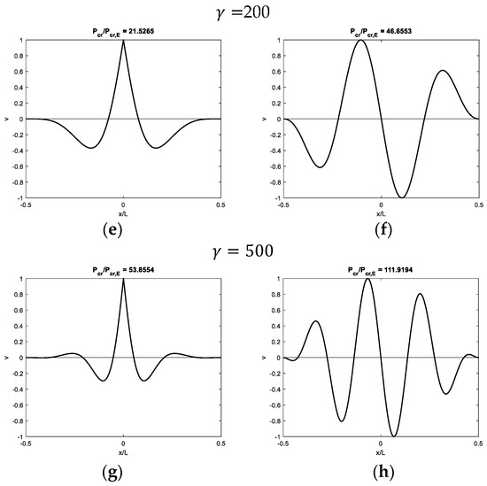 Focusing then on modal shapes corresponding to the second critical load (Figure 5b,d,f,h), sinusoidal asymmetric modal shapes are obtained, with an increasing number of half-waves as γ increases. Such modal shapes are typical of beams with fixed or sliding ends without hinge at the midpoint.